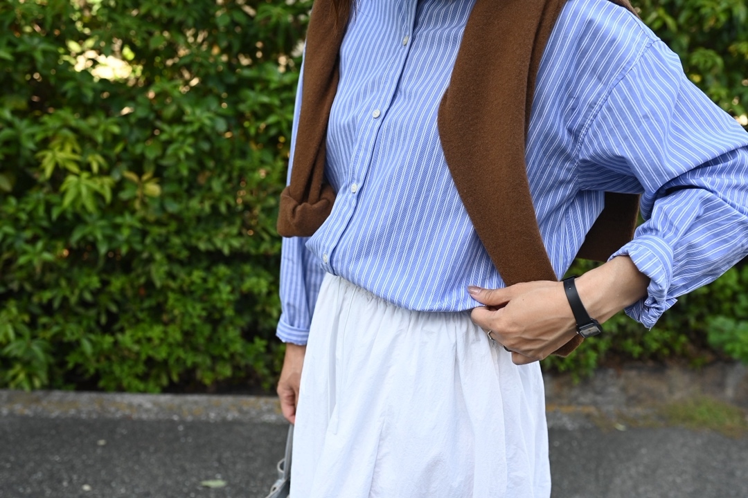 身長156cmの私は、チュニック丈だとバランスがとりづらいのですが、播州織ベーシックシャツの丈感はちょうどいいんです。