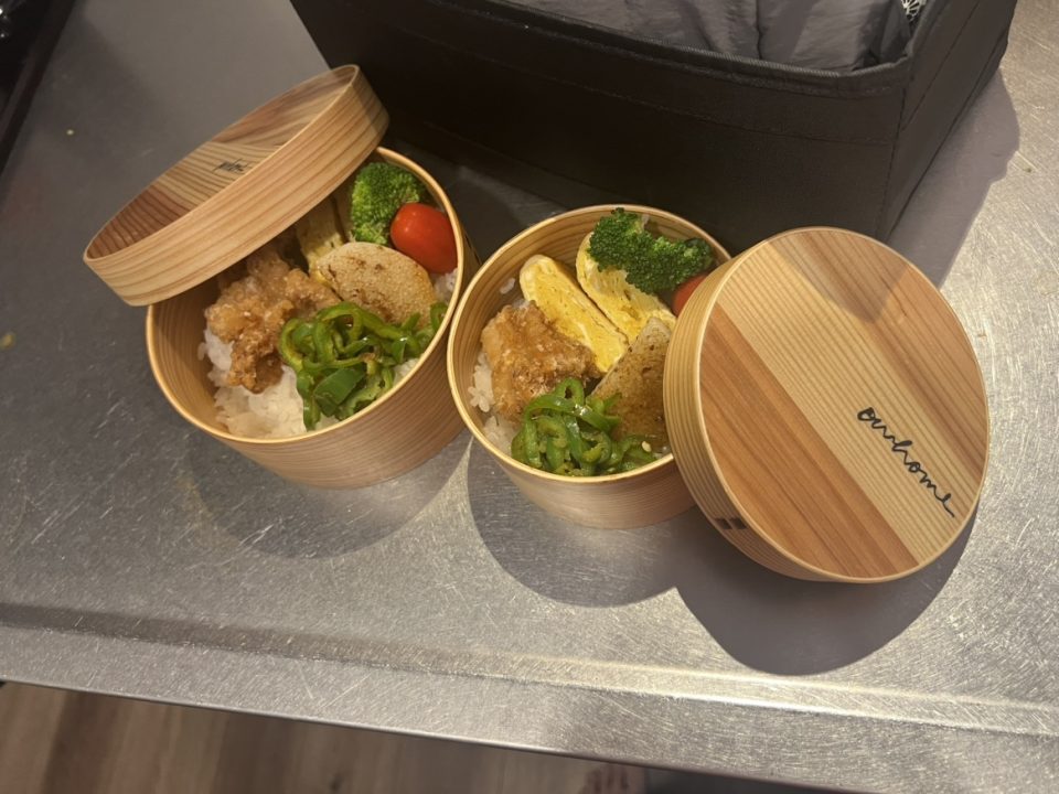 お弁当づくりが終わっていない時は、山本はキッチンとリビング行ったり来たりしながら、お弁当を詰めて仕上げます。
