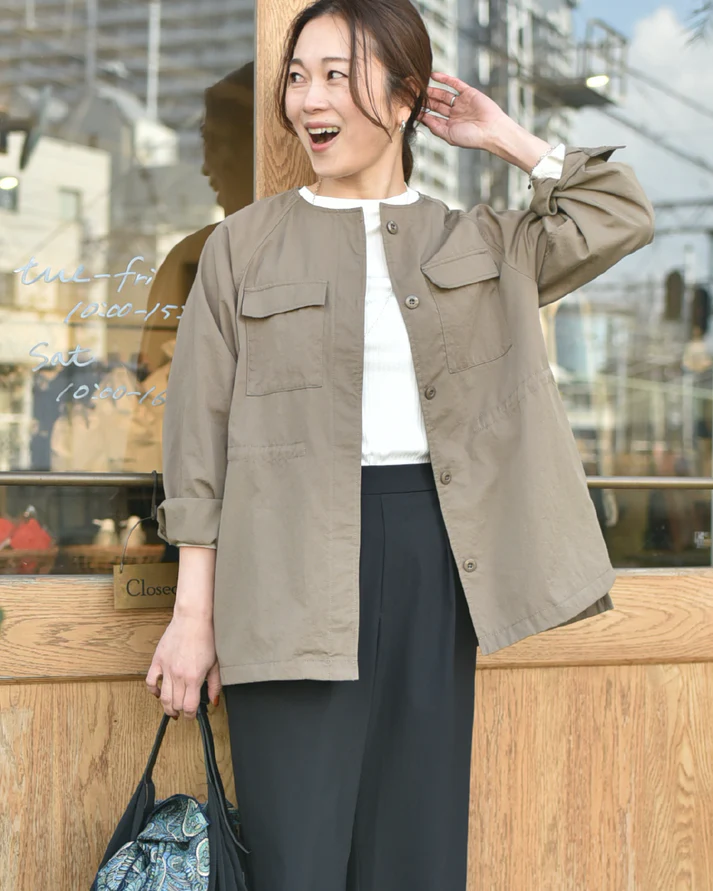 ノーカラーのデザインが、着回しがいろいろ楽しめそう!