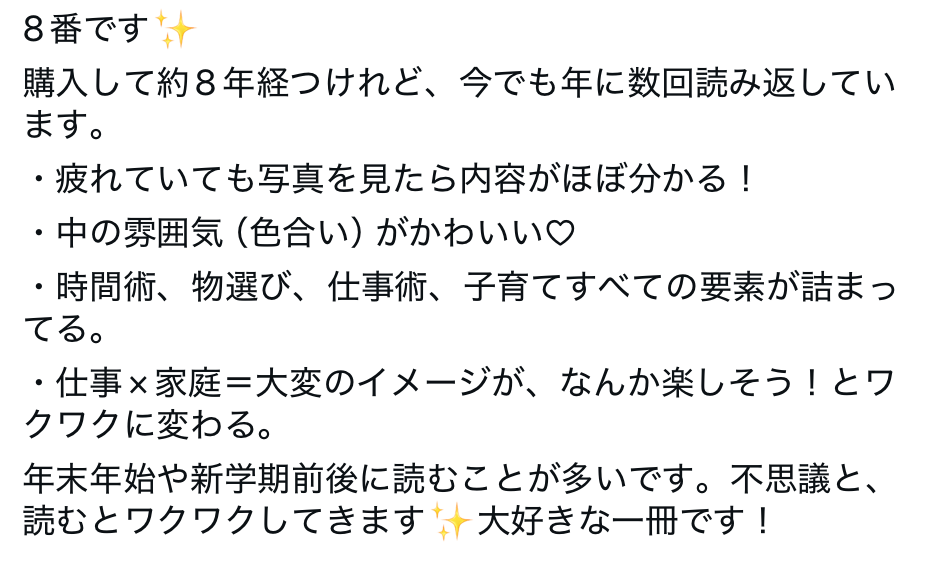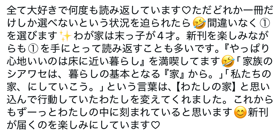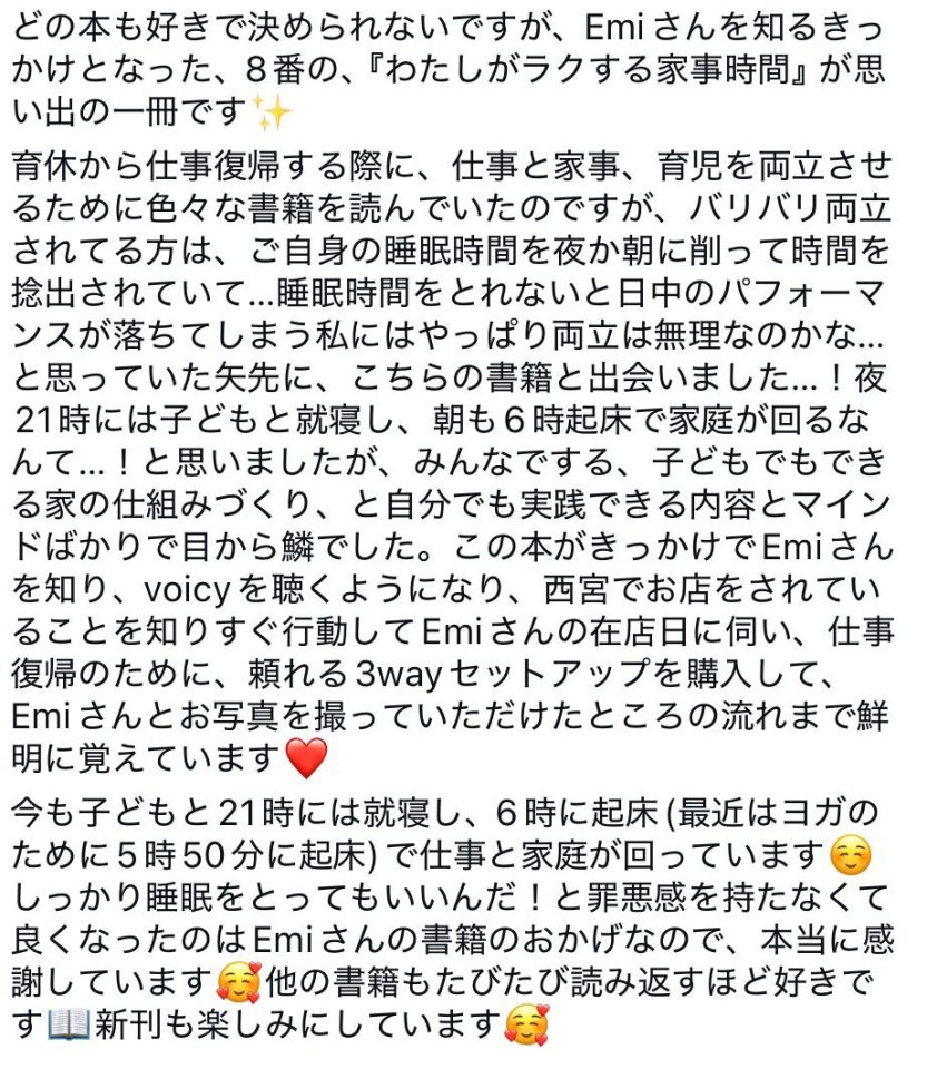 「どれも思い入れが詰まっていて、じ〜んとしてきました!保育園、仕事復帰、小学校…人生のさまざまなステージで熟読し、Emiさんイズムを叩き込んできました」