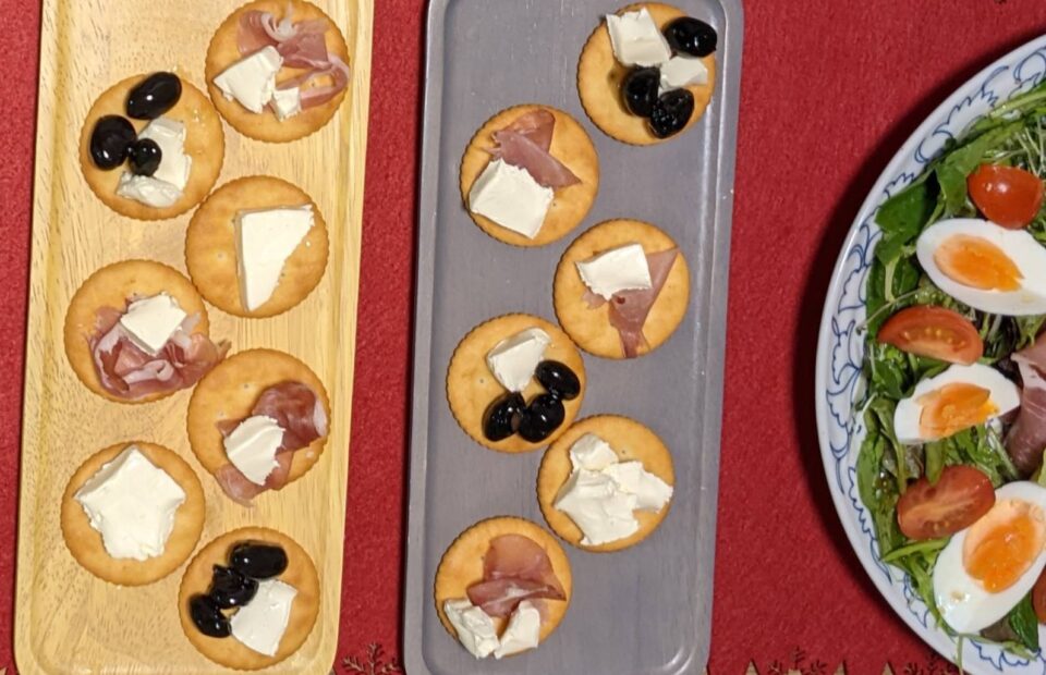 1)クラッカーに、ひと口大に切ったクリームチーズをのせる