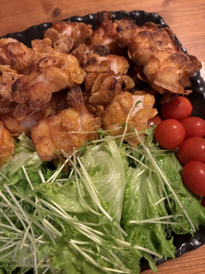3)コーンフレーク(甘くないタイプ)をまぶして揚げる