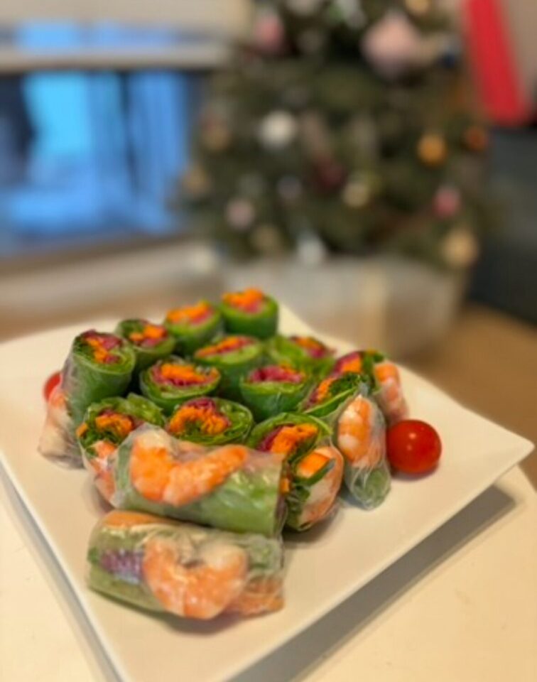具材はボイルエビ、レタス、きゅうり、にんじん、紫キャベツ、大葉など。大人はニラやカイワレも◎