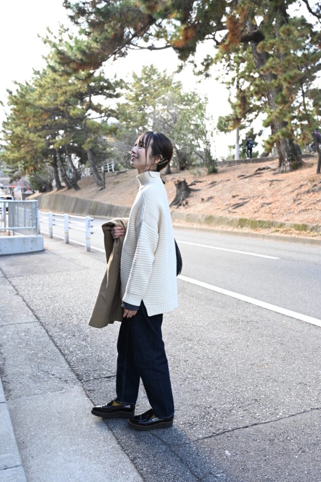 上質ウールのハイネックニット/こだわりシルエットのデニムパンツ/エナメルレザーのローファーシューズ(スタッフ丸中:身長152cm)