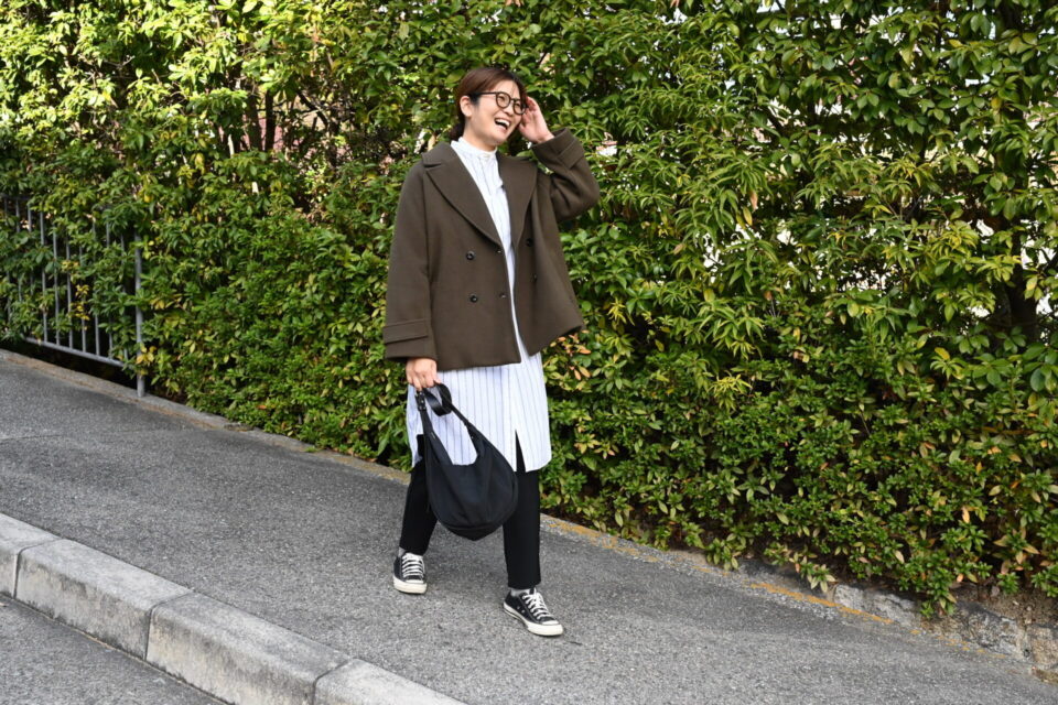 上質ウール100%のテーラードコート/播州織のベーシックシャツ/贅沢とろみタートルカットソー/こだわりシルエットのデニムパンツ(スタッフ吉田:身長165cm)