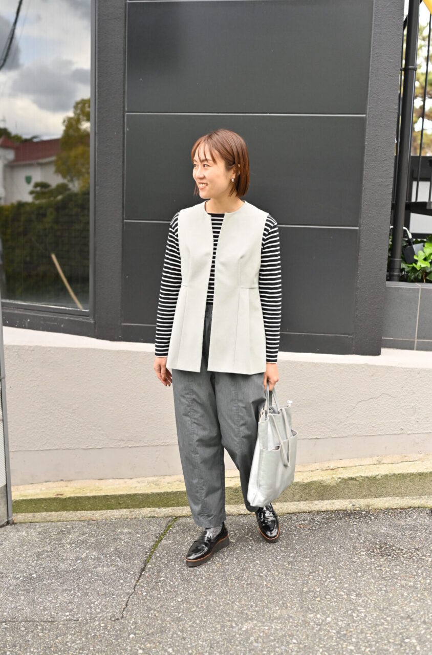 インナーとボトムスをモノトーンに揃えてキリッとさせました。