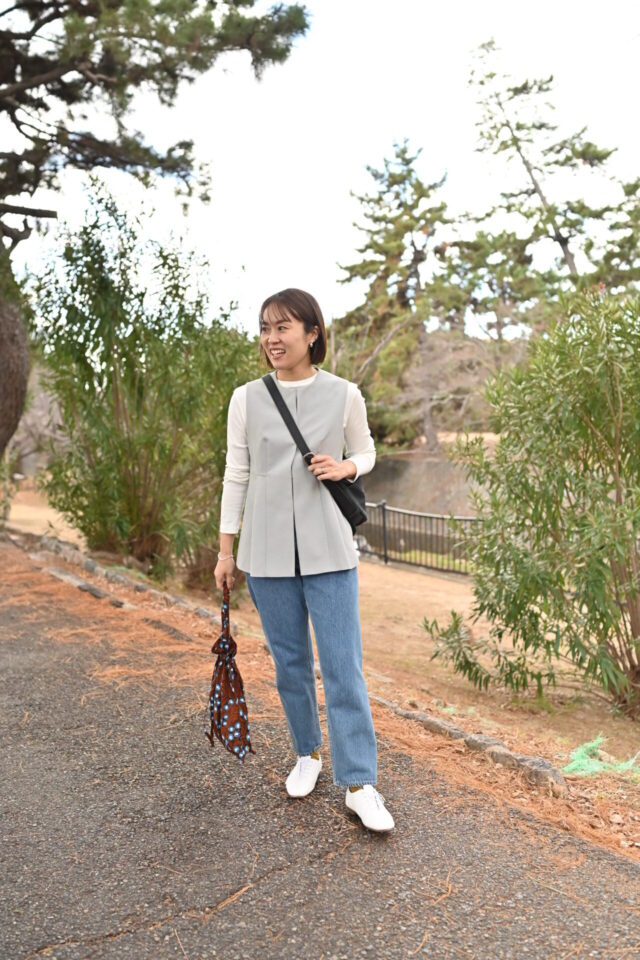 「ペプラムベストは、カジュアルなデニムパンツとも相性ばっちり!