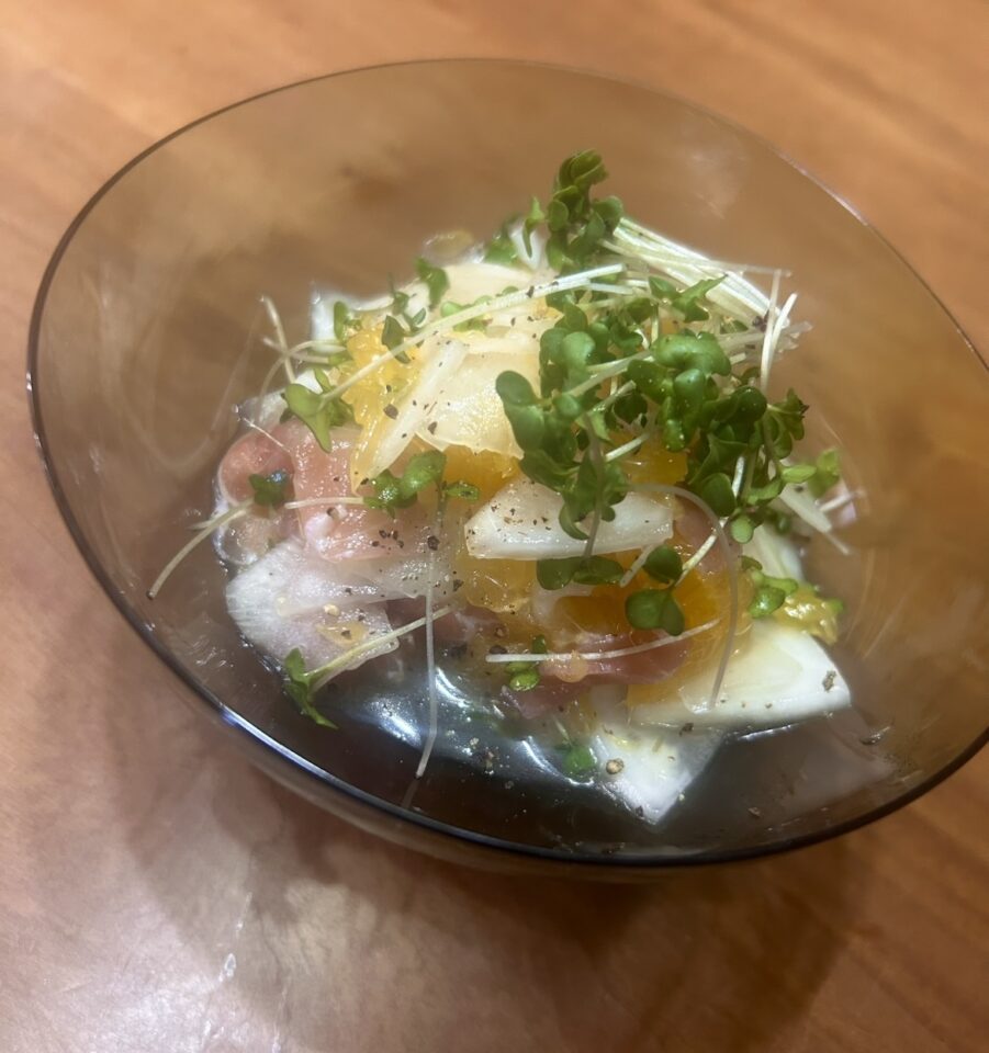 2)かぶの水気を軽く絞り、生ハムとブロッコリースプラウトを加える