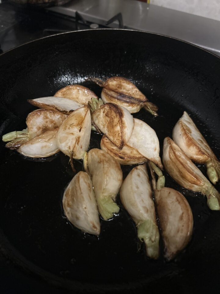 焼き目をつけると香ばしくなり、塩だけでもかぶの甘みが引き出されて美味しいです。(スタッフ黒田)