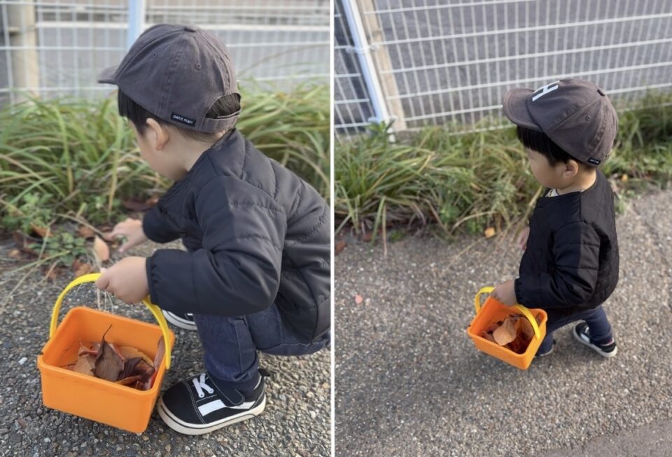 スタッフ古川の2歳の息子くん。葉っぱ集めに夢中〜!