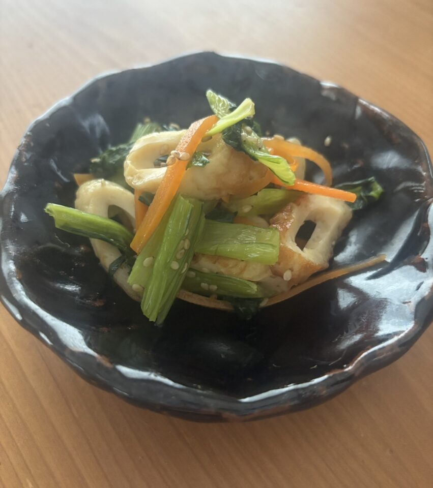 1)小松菜、にんじん、ちくわをごま油で炒める